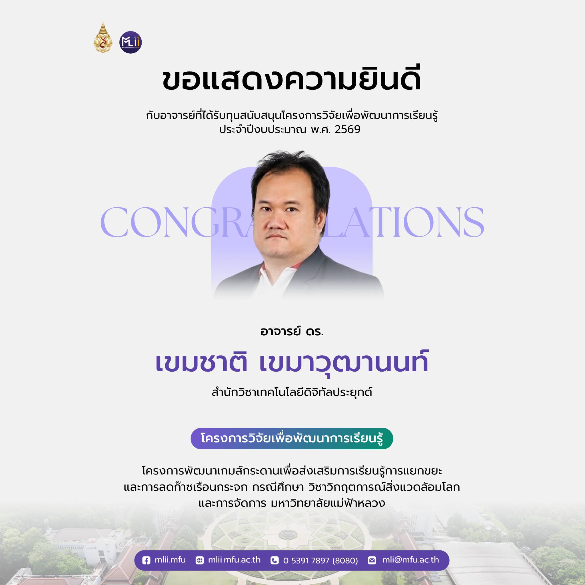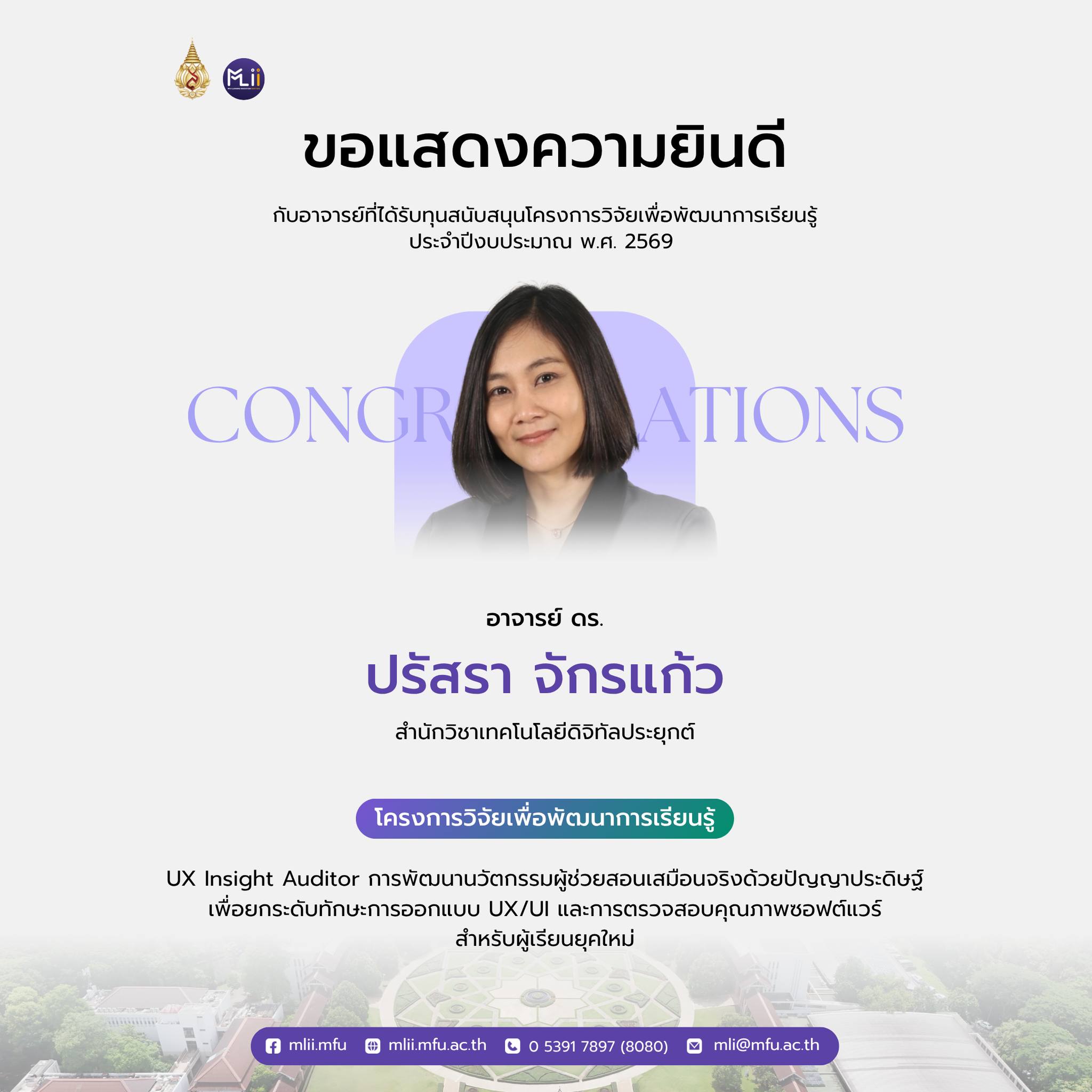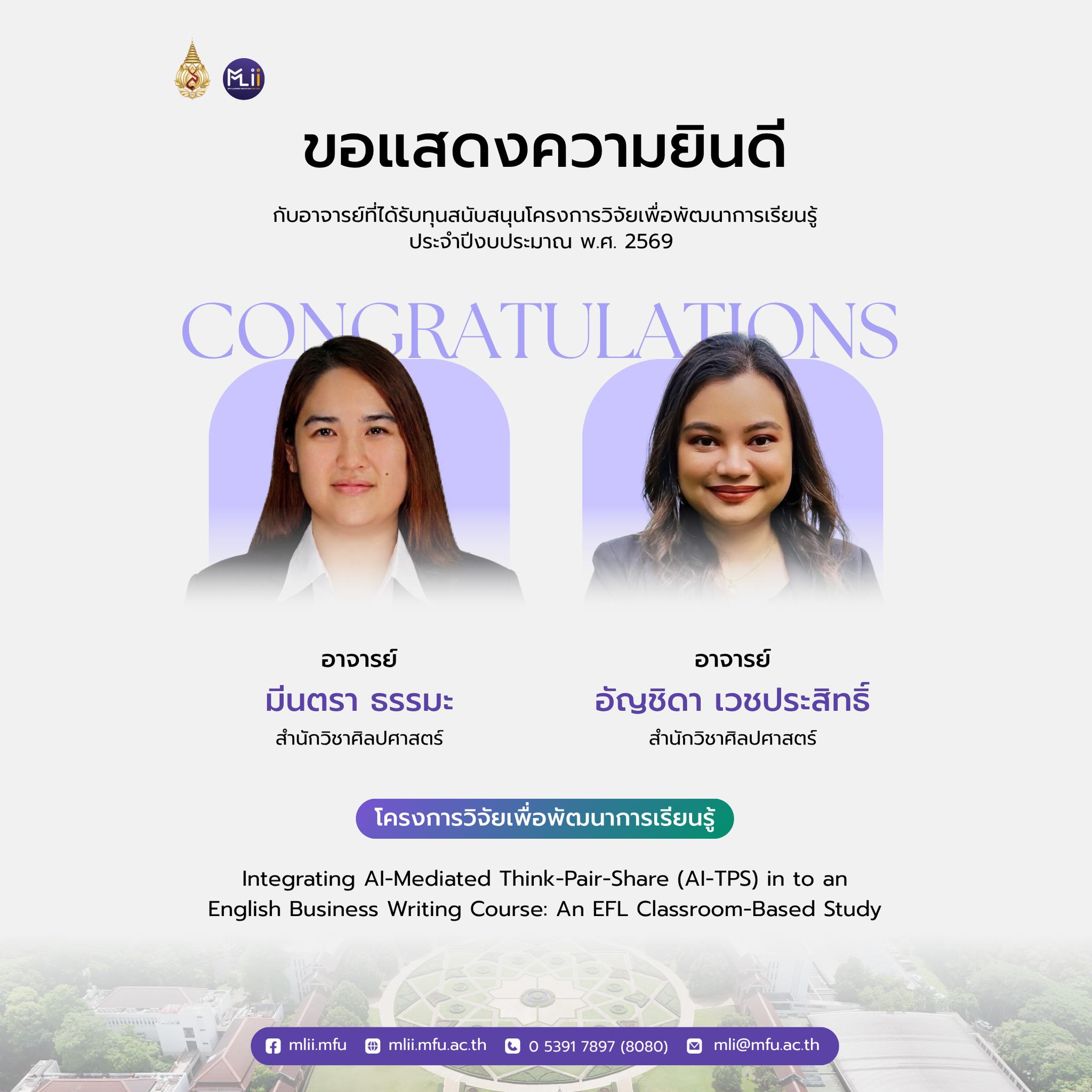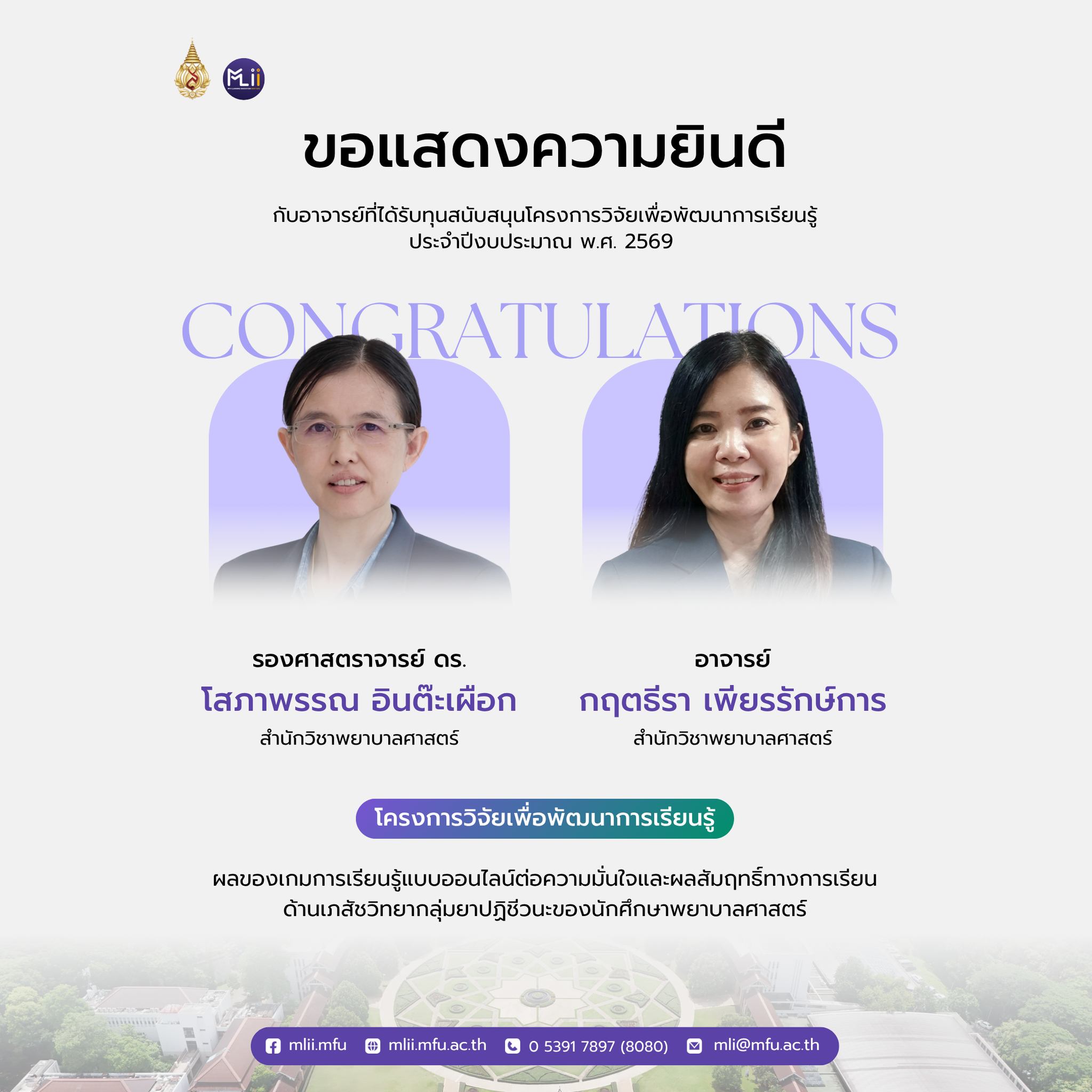 สถาบันนวัตกรรมการเรียนรู้มหาวิทยาลัยแม่ฟ้าหลวง (MLii) ขอแสดงความยินดีกับคณาจารย์ผู้ได้รับทุนสนับสนุนโครงการวิจัยเพื่อพัฒนาการเรียนรู้ ประจำปีงบประมาณ พ.ศ. 2569