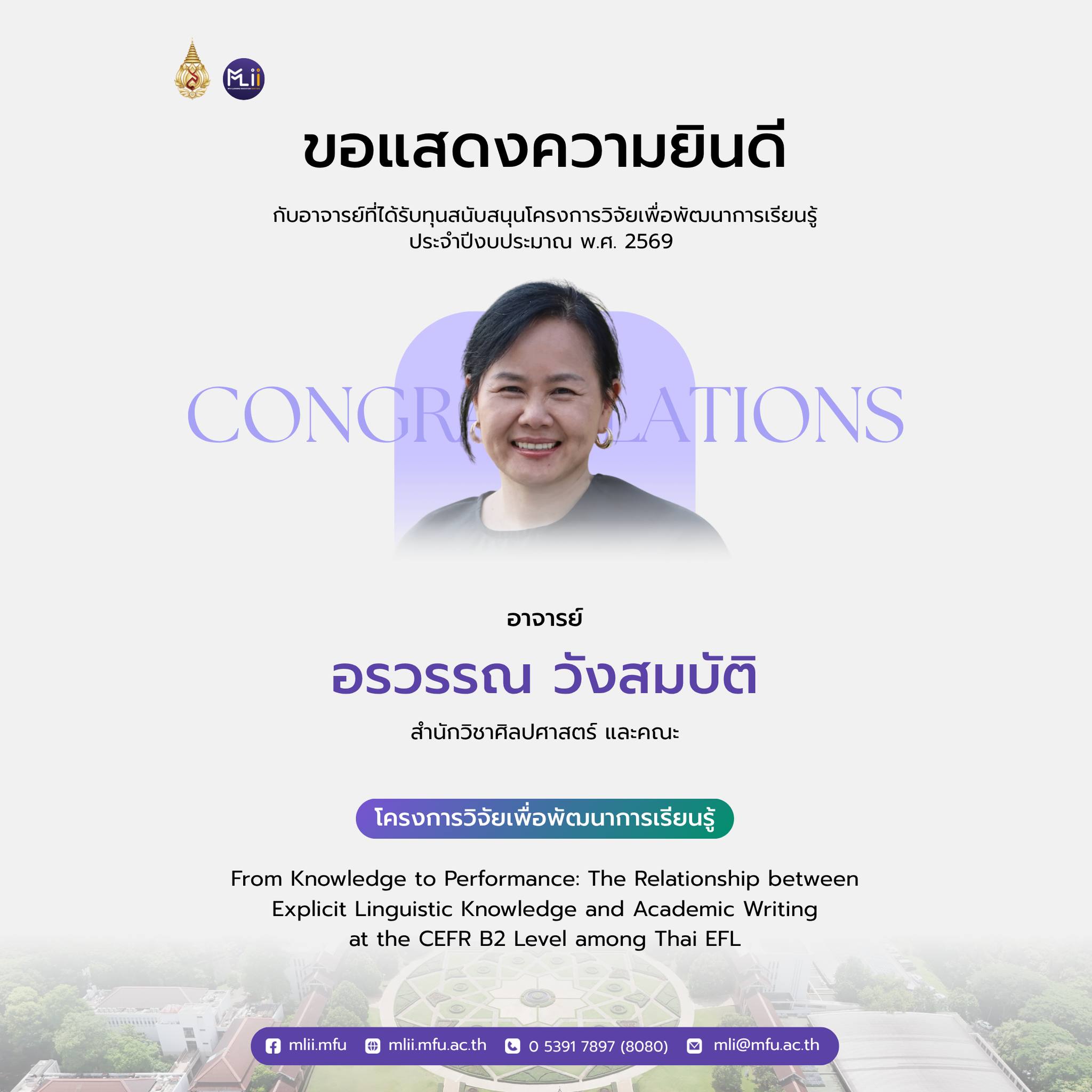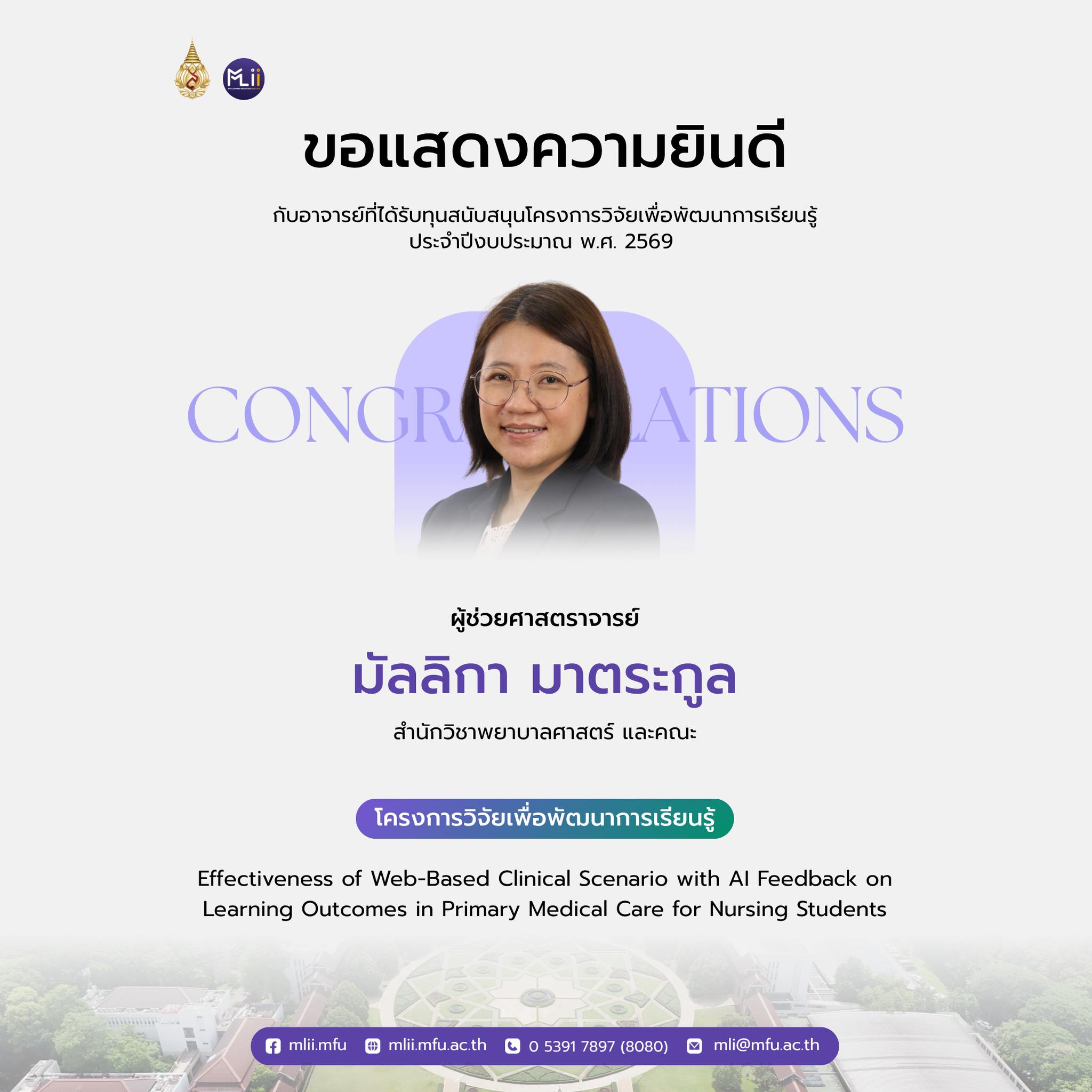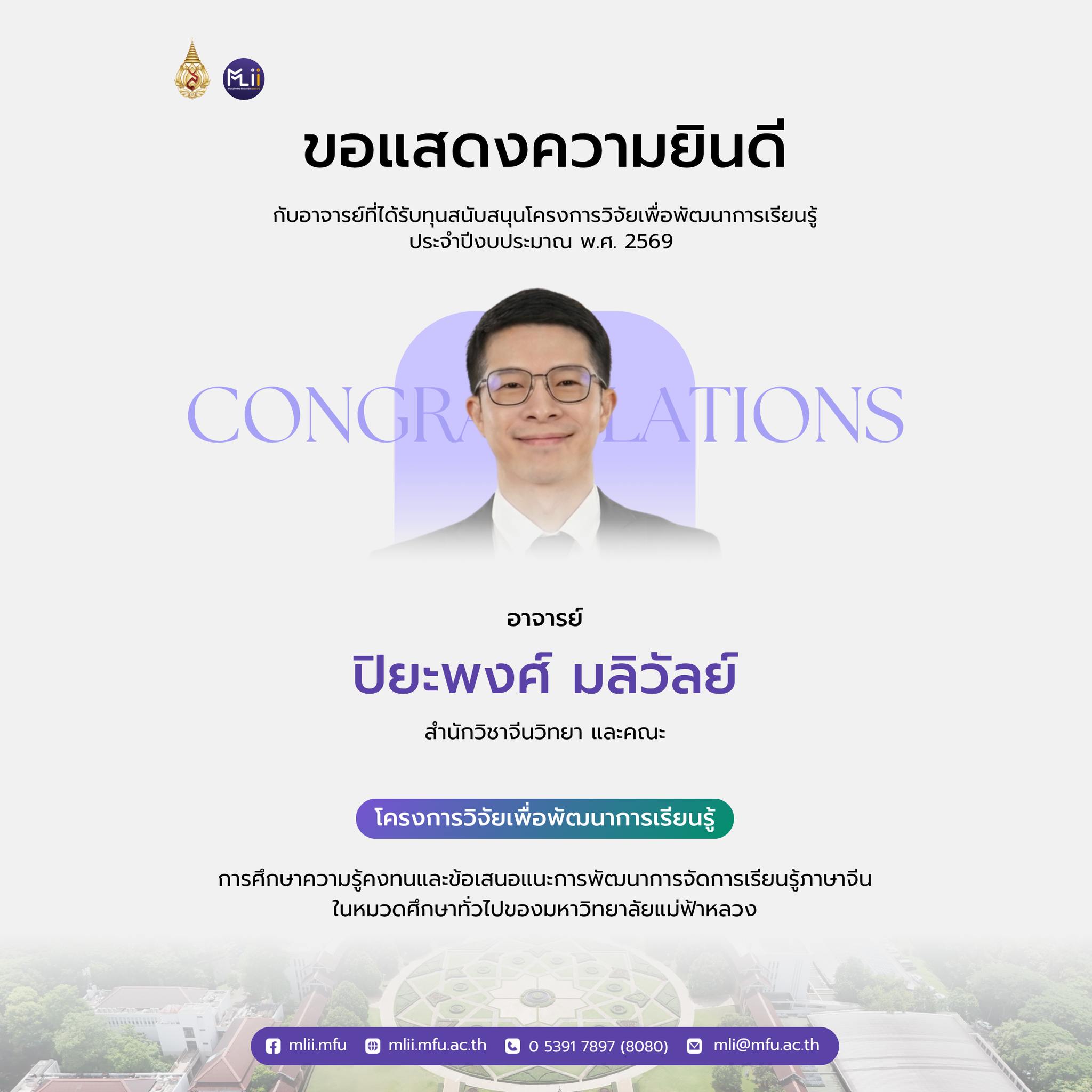 สถาบันนวัตกรรมการเรียนรู้มหาวิทยาลัยแม่ฟ้าหลวง (MLii) ขอแสดงความยินดีกับคณาจารย์ผู้ได้รับทุนสนับสนุนโครงการวิจัยเพื่อพัฒนาการเรียนรู้ ประจำปีงบประมาณ พ.ศ. 2569