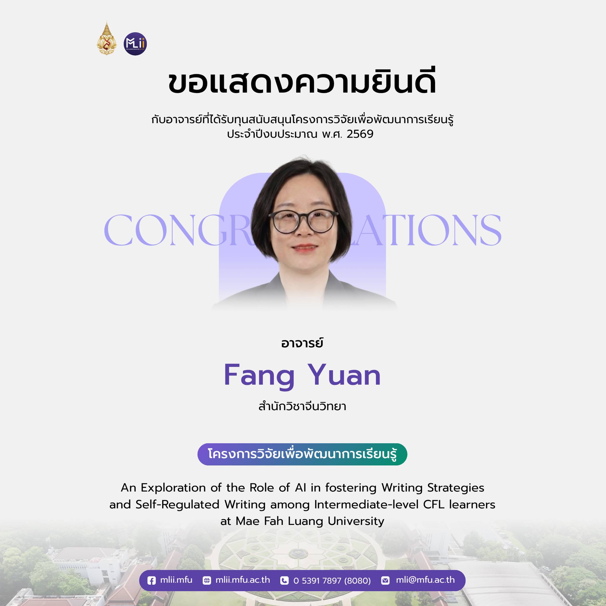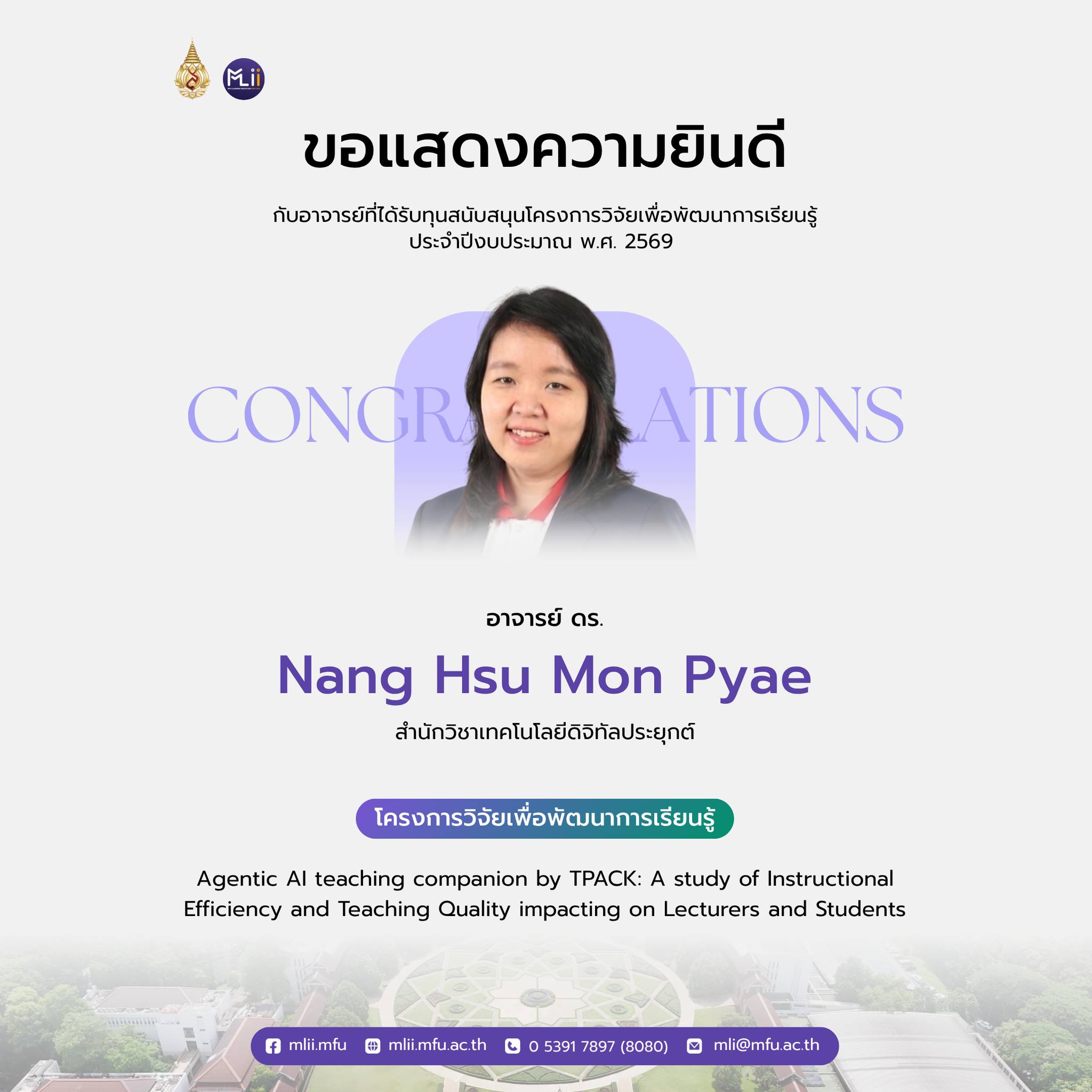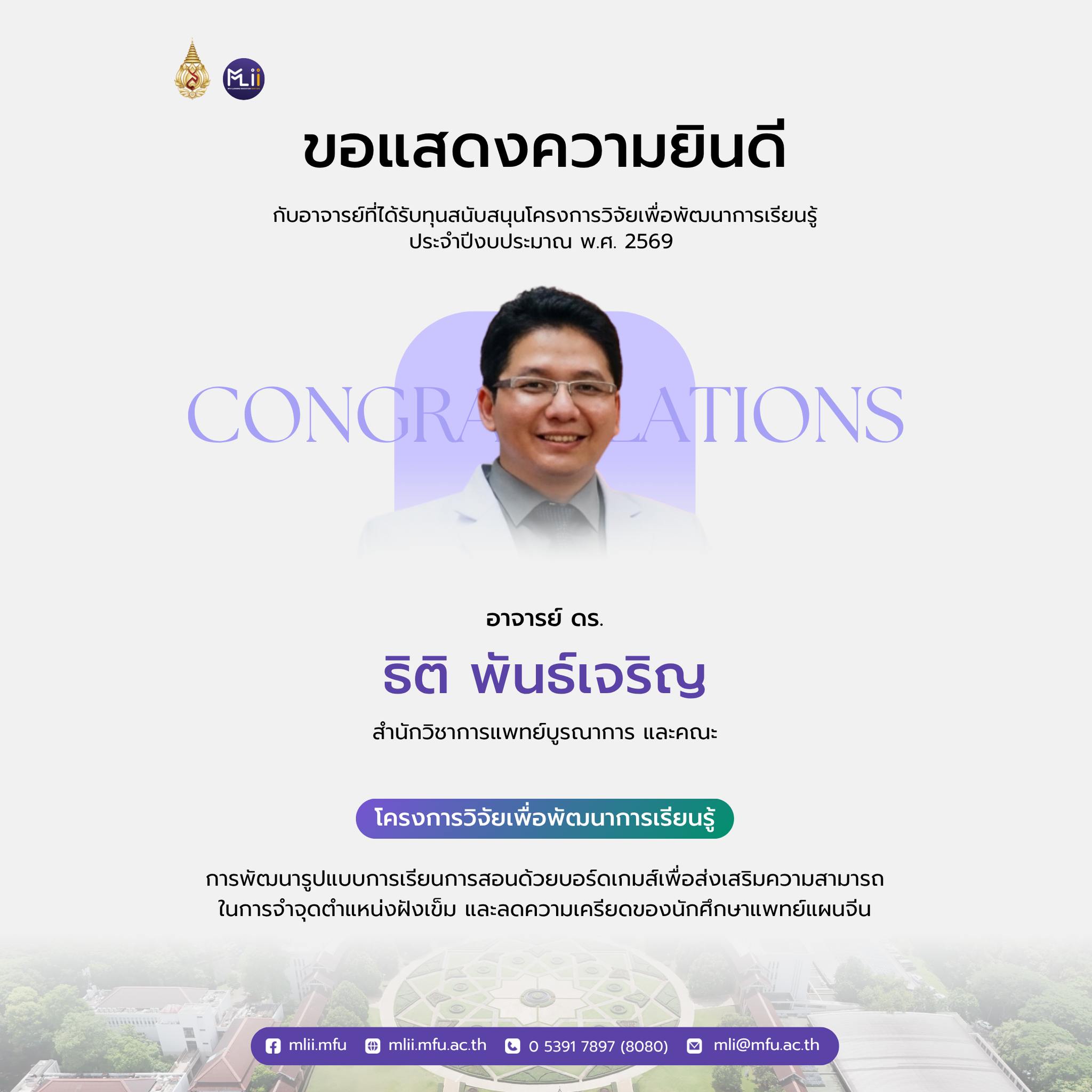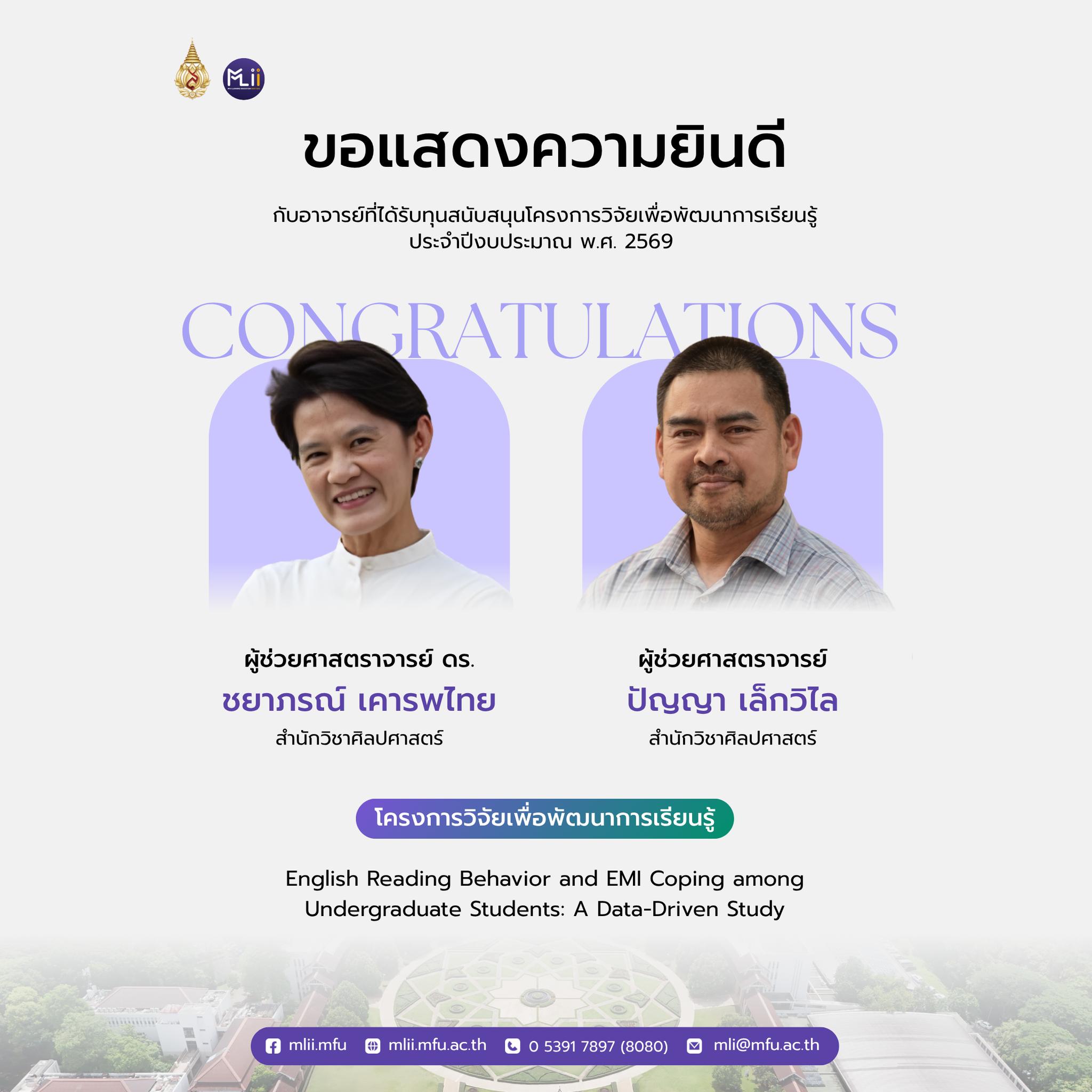 สถาบันนวัตกรรมการเรียนรู้มหาวิทยาลัยแม่ฟ้าหลวง (MLii) ขอแสดงความยินดีกับคณาจารย์ผู้ได้รับทุนสนับสนุนโครงการวิจัยเพื่อพัฒนาการเรียนรู้ ประจำปีงบประมาณ พ.ศ. 2569