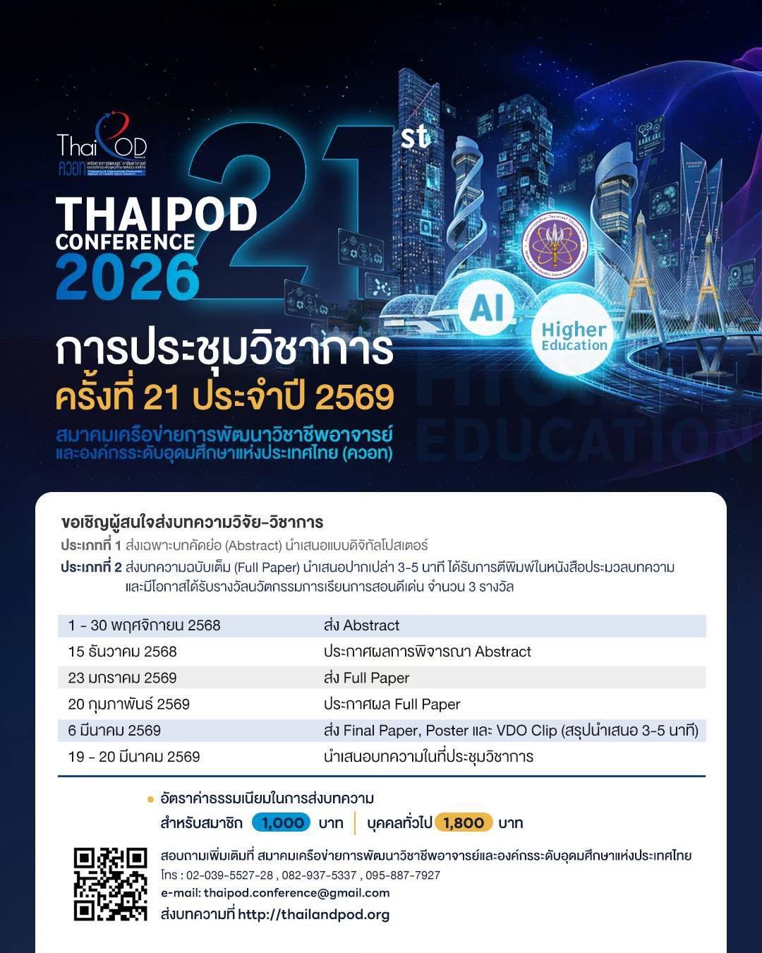 ขอเชิญผู้ที่สนใจส่งบทความวิจัยและบทความวิชาการที่เกี่ยวกับการเรียนการสอน ในการประชุมวิชาการครั้งที่ 21 ประจำปี 2569