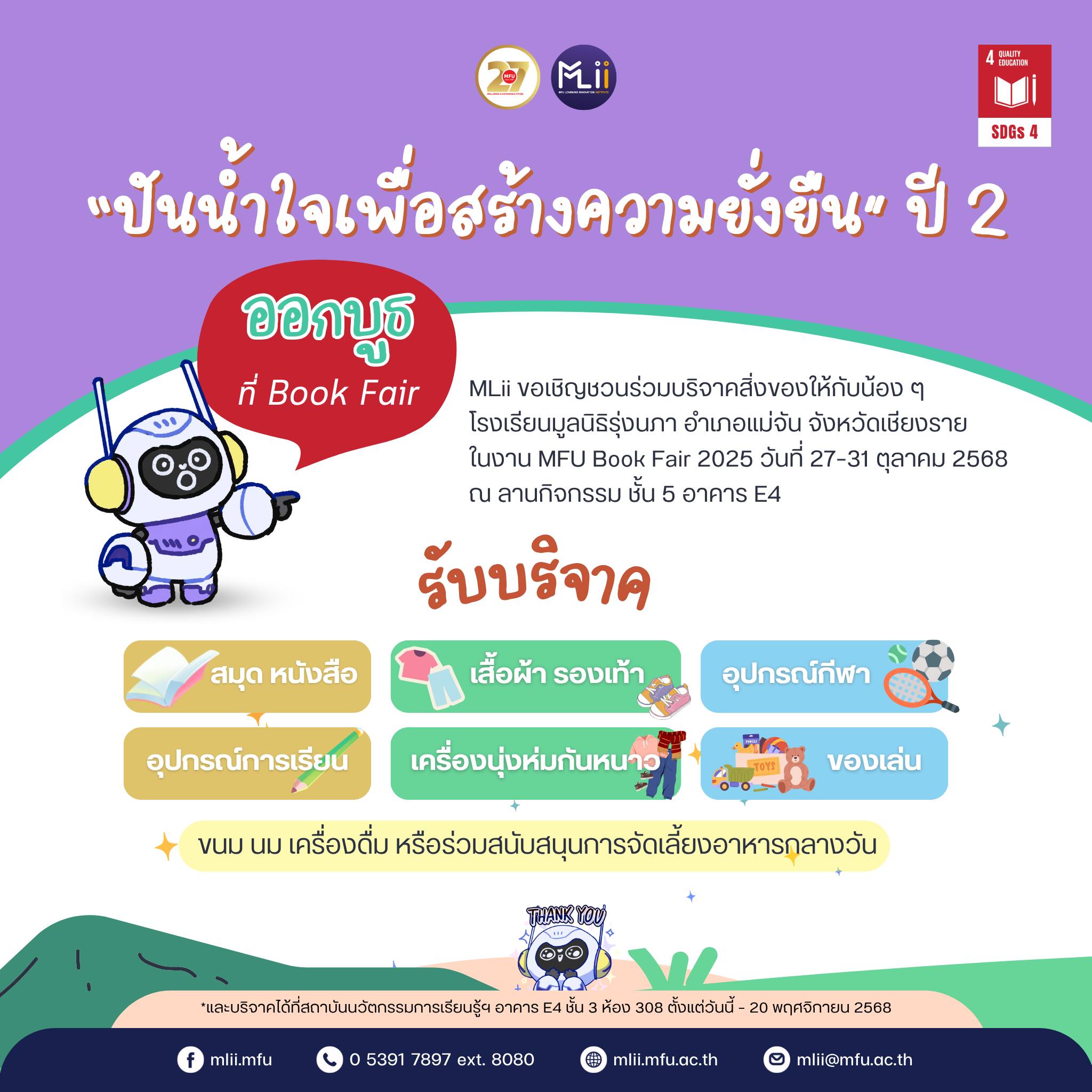 #MLii #MFU #LifelongLearning #ปันน้ำใจเพื่อความยั่งยืน #BookFair2025 #SharingForSustainability #GiveForGood #สร้างรอยยิ้มให้น้อง #SDG4 #QualityEducation #EducationForAll #SustainableFuture